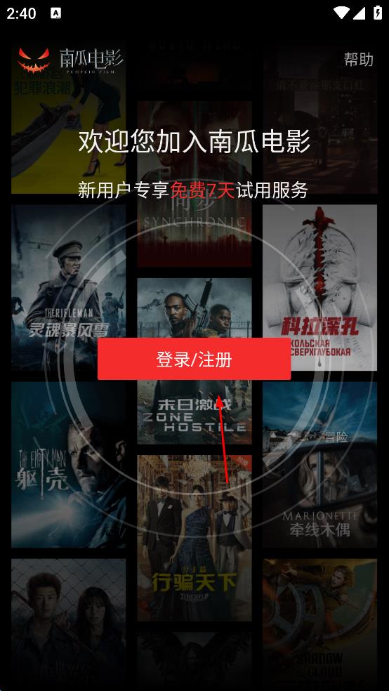 2、進(jìn)入南瓜電影歡迎頁面,看到有“新用戶專享免費7天試用服務(wù)”的提示,以及“登錄/注冊”按鈕,點擊“登錄/注冊”按鈕,進(jìn)入登錄界面。