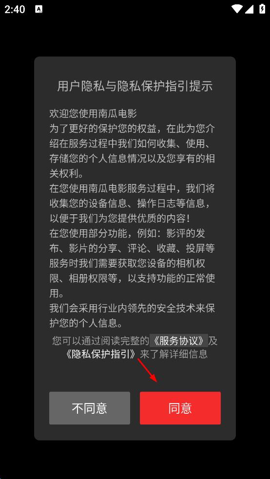 1、打開南瓜電影app,會彈出用戶隱私與隱私保護(hù)指引提示框,提示收集設(shè)備信息、獲取權(quán)限等內(nèi)容,仔細(xì)閱讀后,點擊“同意”按鈕。
