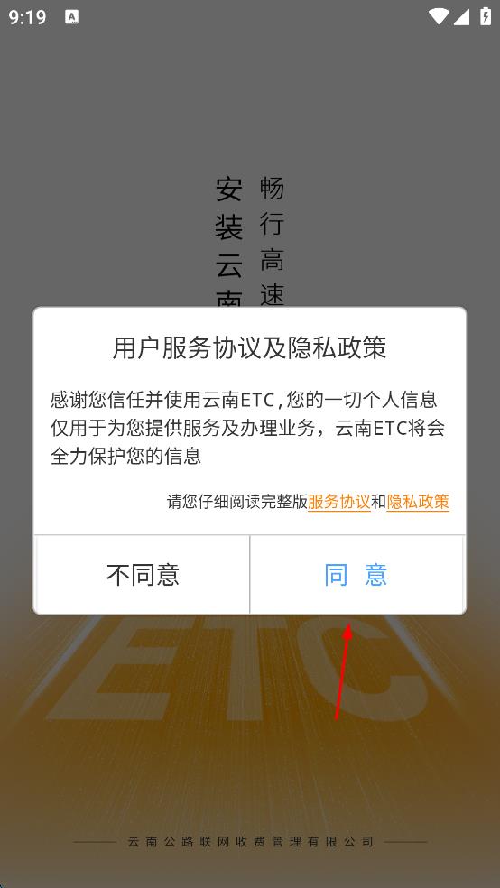 1、打開云南ETC軟件,會彈出用戶服務(wù)協(xié)議及隱私政策提示框,仔細閱讀后,點擊同意按鈕。
