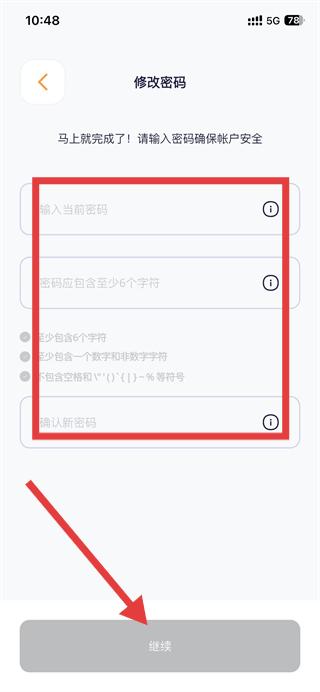 4、按照要求輸入密碼,點(diǎn)擊繼續(xù)即可完成密碼修改。