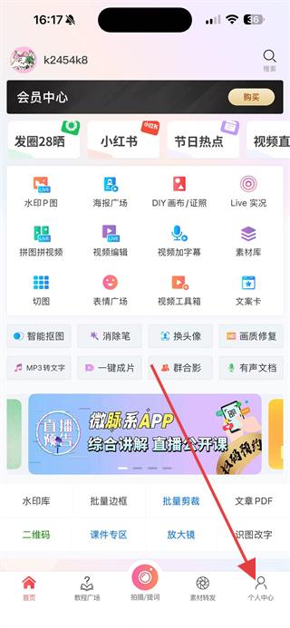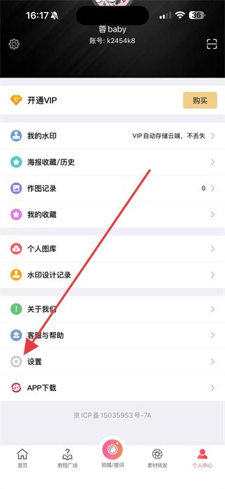 1、打開菱形網(wǎng)狀水印APP,點擊右下角個人中心圖標(biāo),進入專屬個人頁面。