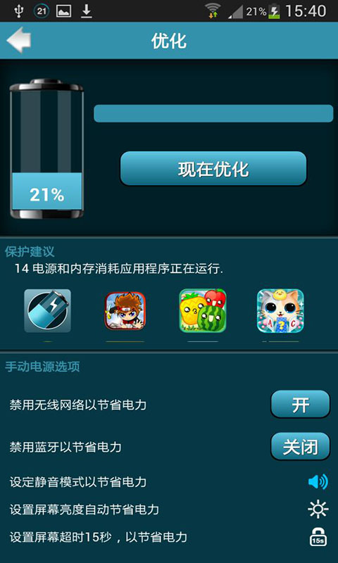 《超級(jí)電池管家》我們只做電池省電優(yōu)化所以更專業(yè),一鍵省電優(yōu)化,方便好用效率高。支持三種省電模式:省電模式、睡眠模式、自定義模式,最大程度的延長(zhǎng)您愛機(jī)的待機(jī)時(shí)間,最大程度的保護(hù)您愛機(jī)的電池,延長(zhǎng)電池的壽命,在電池狀態(tài)頁面可以看到手機(jī)電池可使用時(shí)間,并有清理進(jìn)程功能加快手機(jī)運(yùn)行速度,延長(zhǎng)待機(jī)時(shí)間。