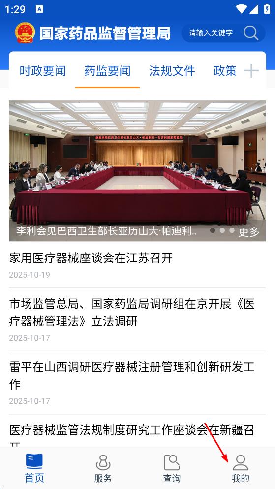 1、打開國家藥品監(jiān)督管理局軟件,點(diǎn)擊頁面右下角“我的”按鈕,進(jìn)入個(gè)人相關(guān)頁面。