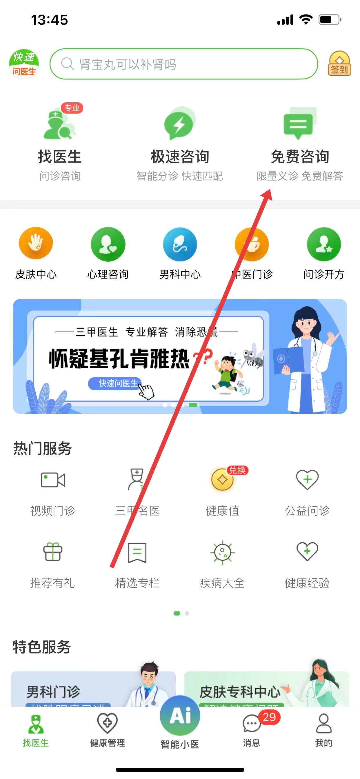 1、打開快速問醫(yī)生APP首頁,點(diǎn)擊免費(fèi)咨詢選項(xiàng)。