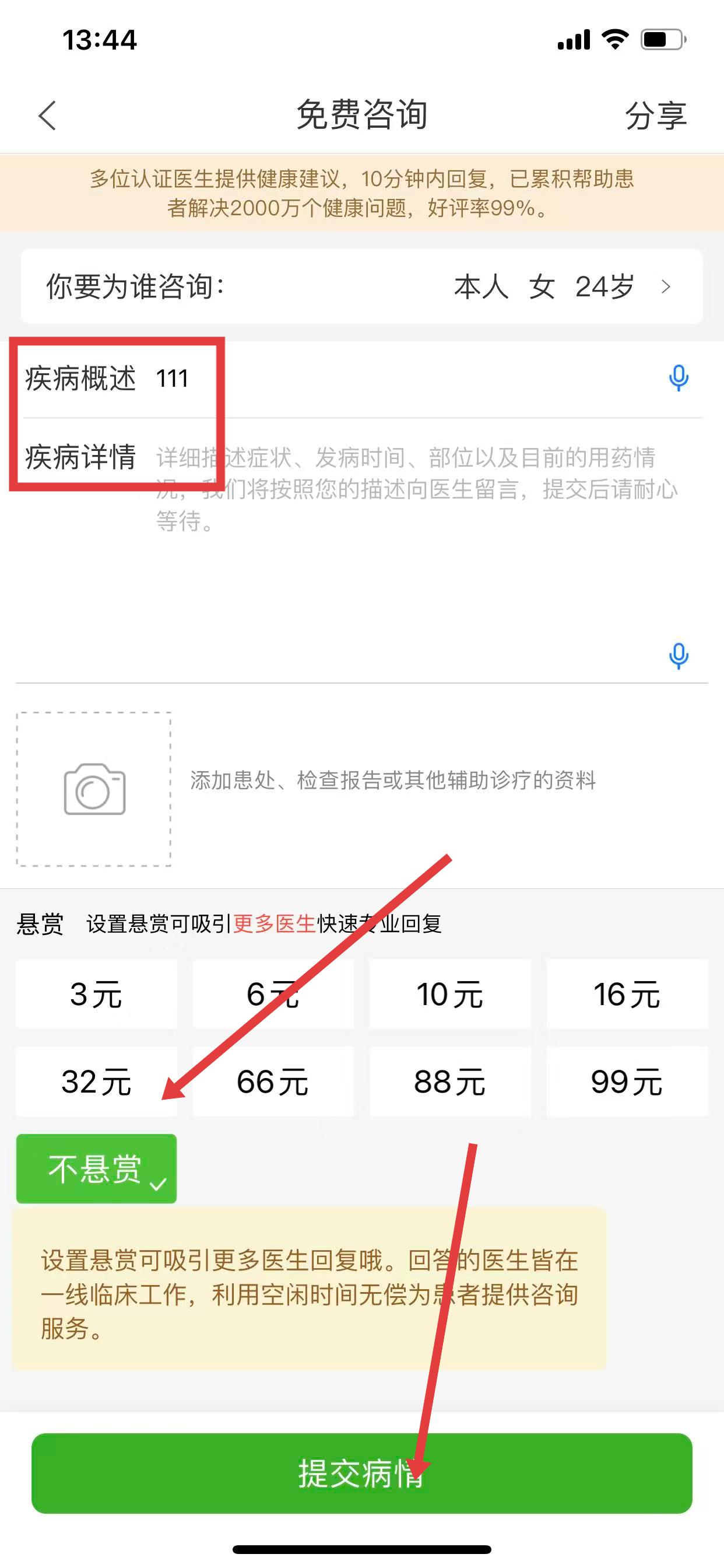 2、在免費(fèi)咨詢頁,填寫疾病概述、疾病詳情,選擇不懸賞。