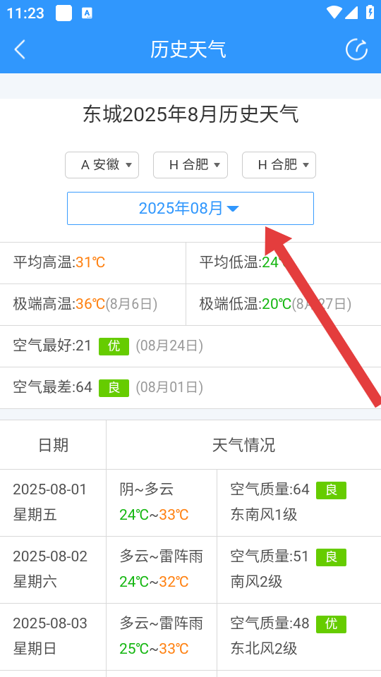 2、在歷史天氣頁(yè)面中,點(diǎn)擊2025年08月這樣的年月選擇框,后面會(huì)彈出選擇年月的日期選擇面板。