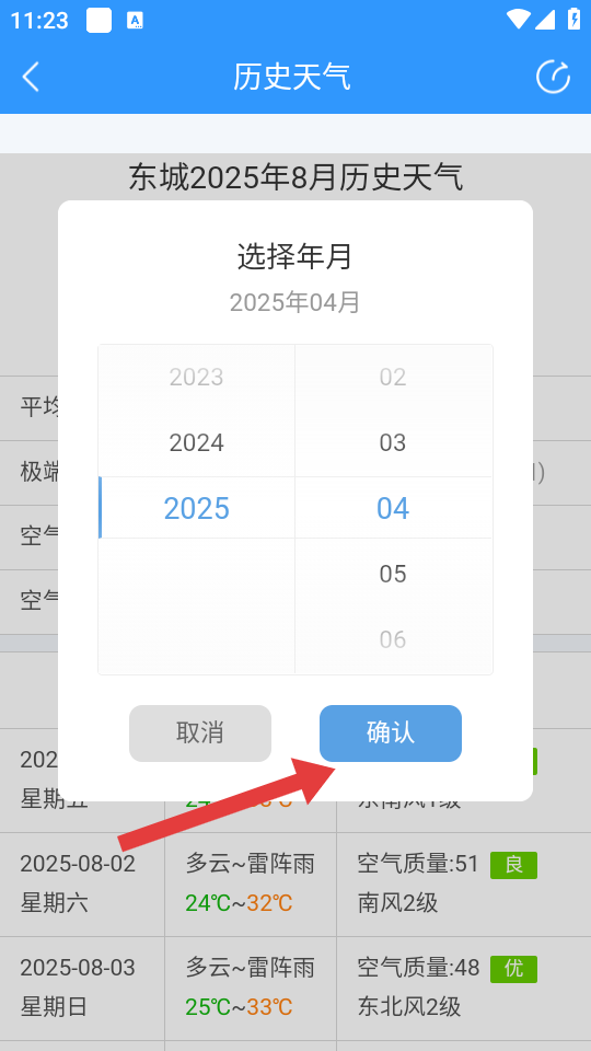 3、在日期選擇面板中,選擇需要查詢的具體年份和月份如2025年04月,點(diǎn)擊確認(rèn)按鈕,就可以查看該年月的歷史天氣數(shù)據(jù)。