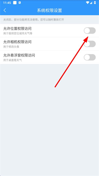 4、在系統(tǒng)權(quán)限設(shè)置頁(yè)面,點(diǎn)擊允許位置權(quán)限訪問(wèn)右側(cè)的開關(guān),將其打開即可開啟定位權(quán)限。