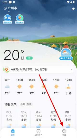 1、打開2345天氣王APP,點(diǎn)擊右下角工具選項(xiàng)。