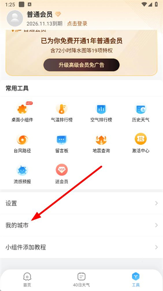 2、在工具頁(yè)面下方選項(xiàng)中,點(diǎn)擊我的城市選項(xiàng)。