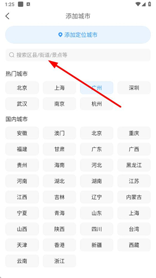 4、在添加城市頁(yè)面的搜索框中輸入城市名稱,或在熱門城市、國(guó)內(nèi)城市列表中選擇要添加的城市即可。