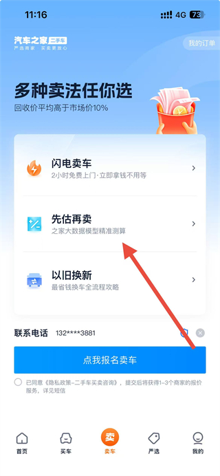 2、在賣車頁(yè)面,選擇先估再賣選項(xiàng),該功能依托之家大數(shù)據(jù)模型可精準(zhǔn)測(cè)算車輛價(jià)值。