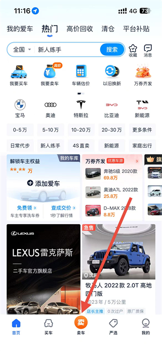 1、打開(kāi)二手車之家APP,在底部導(dǎo)航欄找到賣車選項(xiàng)并點(diǎn)擊,進(jìn)入賣車服務(wù)頁(yè)面。