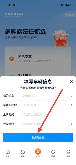 3、進(jìn)入填寫(xiě)車輛信息界面,依次完善信息,然后點(diǎn)擊免費(fèi)估值即可獲取車輛估價(jià)。