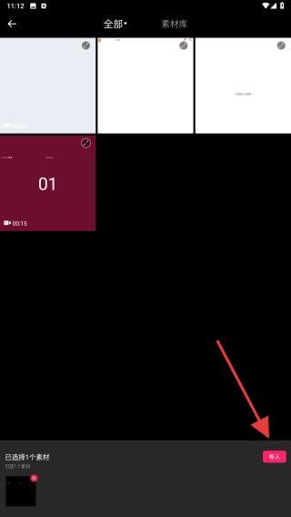 2、進(jìn)入素材選擇頁面,從相冊(cè)中挑選想要同框的視頻素材,選好后點(diǎn)擊右下角的導(dǎo)入按鈕。