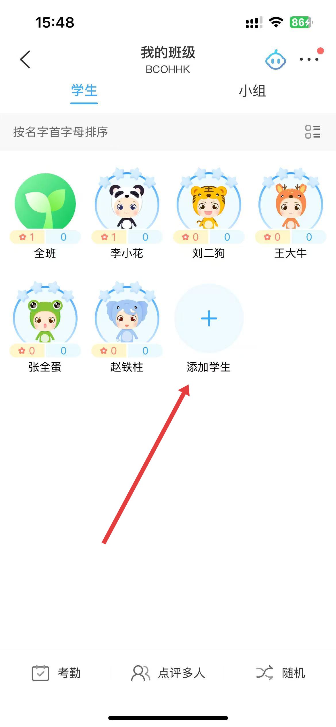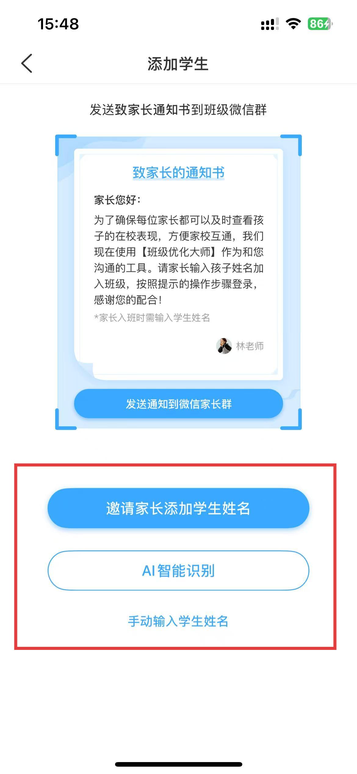 3、在添加學(xué)生界面,可以選擇邀請家長協(xié)助添加,也可以使用AI智能識別快速錄入學(xué)生信息,還能通過手動輸入學(xué)生姓名的方式添加班級學(xué)生。