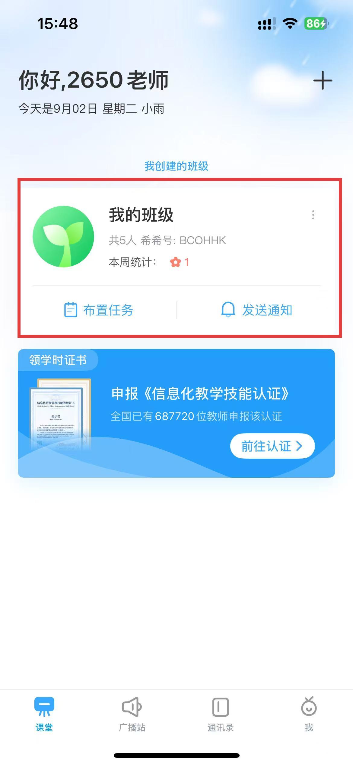 1、打開班級優(yōu)化大師app進入課堂界面,在我創(chuàng)建的班級板塊中點擊要添加學(xué)生的班級選項。