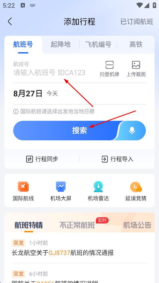 3、在添加行程頁,選擇“航班號”標簽,輸入航班號(如CA123 ),選定日期,點擊“搜索”查詢行程詳情。