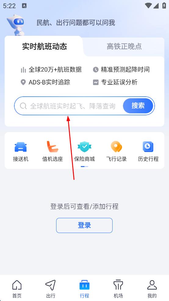 2、在行程頁面“實時航班動態(tài)”欄搜索框,輸入航班信息,或點擊“添加行程”,進入添加行程界面。