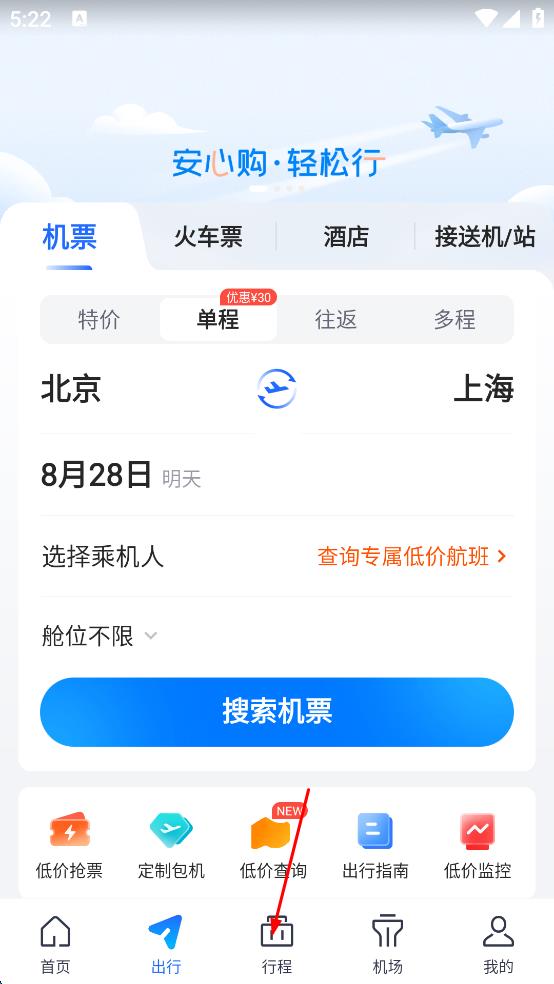 1、打開出行軟件,點擊底部“行程”選項,進入行程頁面,可看到實時航班動態(tài)查詢及相關服務入口。