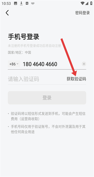 4、手機(jī)號(hào)登錄界面輸入手機(jī)號(hào),點(diǎn)擊“獲取驗(yàn)證碼”,輸入收到的驗(yàn)證碼后完成賬號(hào)登錄操作。