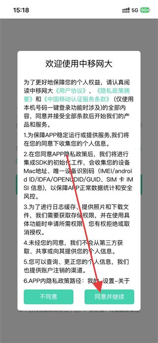 1、打開中移網(wǎng)大軟件,在彈出的頁面,點擊同意并繼續(xù)。