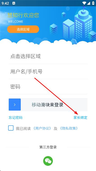 1、打開慧知行小學版,點擊右下角的家長綁定。