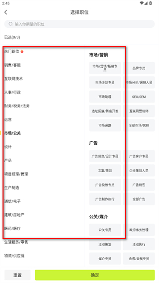 3、在選擇職位界面,從熱門職位、市場/營銷等分類中挑選新的意向職位。