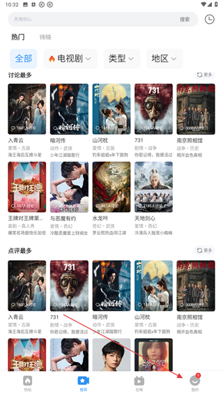 1、啟動(dòng)影視大全的APP,點(diǎn)擊首頁(yè)導(dǎo)航欄中我的按鈕。