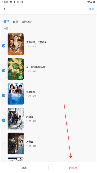 4、勾選要?jiǎng)h除的視頻記錄后,點(diǎn)擊右下角刪除的按鈕即可。