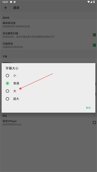 5、當頁面彈出字幕大小選擇的選項中,點擊大即可設置成功。