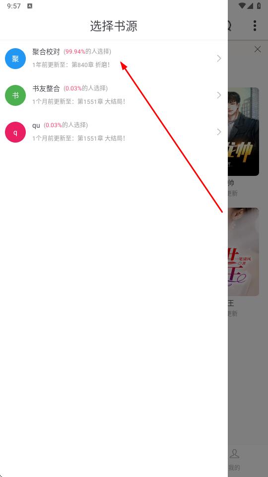 2、點擊書架內小說,進入選擇書源界面,可選聚合校對高占比等書源,查看更新章節(jié)信息。