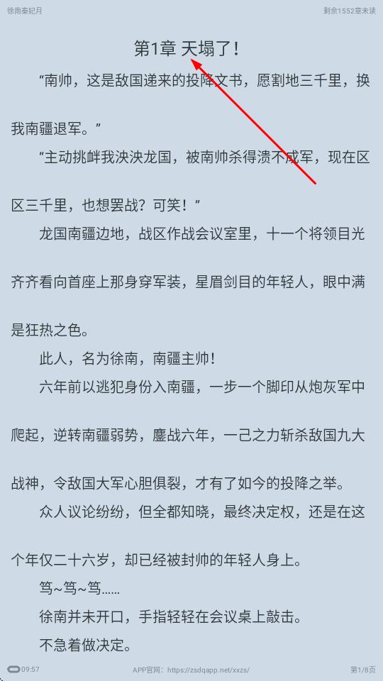 3、選定書源后進入閱讀頁,瀏覽《徐南秦妃月》第1章天塌了內容,正式進入開啟小說閱讀。