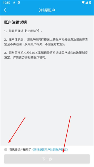 5、在注銷賬戶頁(yè)面,勾選用戶注銷賬戶協(xié)議,點(diǎn)擊下一步。