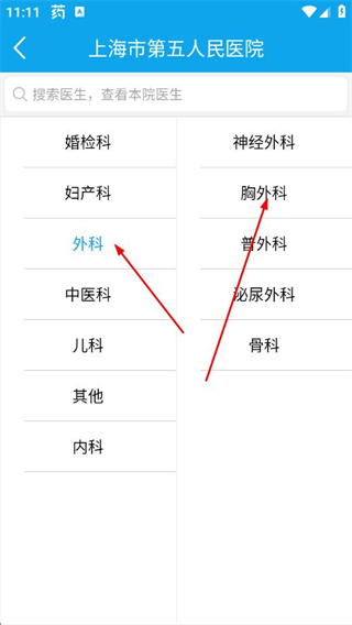 3、在醫(yī)院科室選擇頁(yè)面,先選擇科室類別,再選擇具體科室。