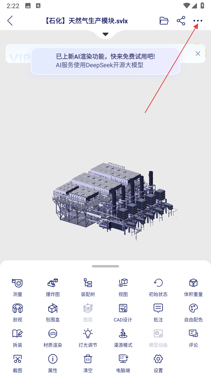 2、在模型查看界面右上角,點擊三點形狀的更多操作按鈕,彈出選項列表。
