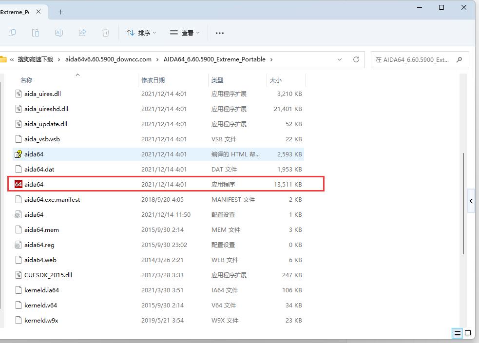 2、在解壓出來的文件中找到【aida64】應(yīng)用程序圖標(biāo),雙擊左鍵啟動;