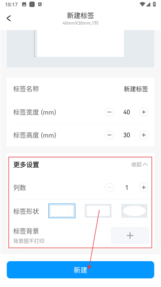 3、點擊更多設(shè)置可調(diào)整列數(shù)標(biāo)簽形狀和背景樣式,完成后點擊新建。