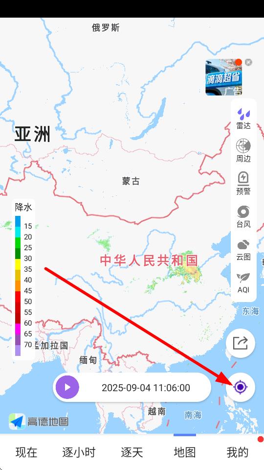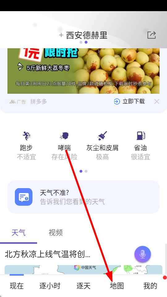 1、打開(kāi)中國(guó)天氣APP進(jìn)入主界面,點(diǎn)擊底部導(dǎo)航欄中的地圖選項(xiàng)進(jìn)入地圖頁(yè)面。