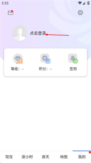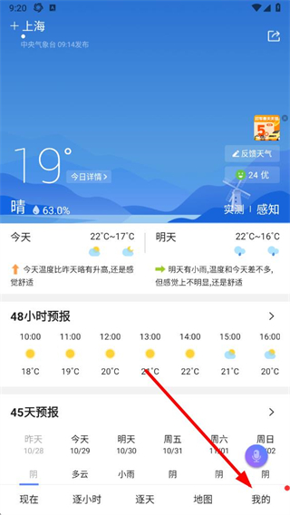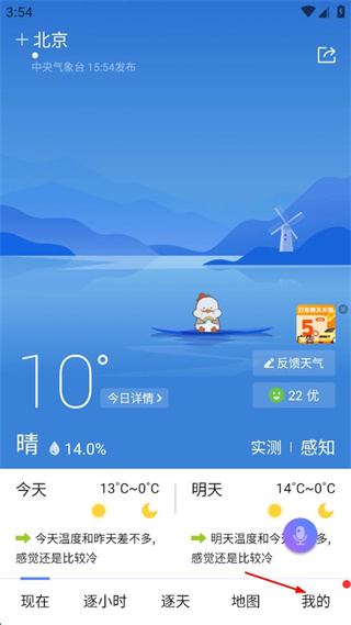 1、在中國(guó)天氣app天氣頁(yè)面點(diǎn)擊我的選項(xiàng),進(jìn)入個(gè)人頁(yè)面。