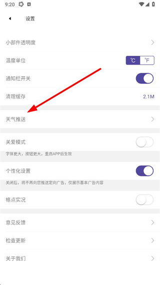 3、在設(shè)置頁(yè)面點(diǎn)擊天氣推送選項(xiàng),即可進(jìn)入天氣推送設(shè)置頁(yè)面。