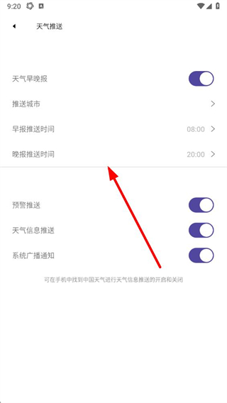 4、在此頁(yè)面可對(duì)天氣早晚報(bào)、推送城市、早報(bào)推送時(shí)間、晚報(bào)推送時(shí)間、預(yù)警推送等進(jìn)行設(shè)置。