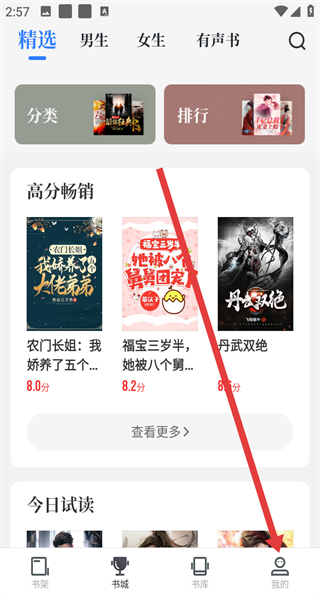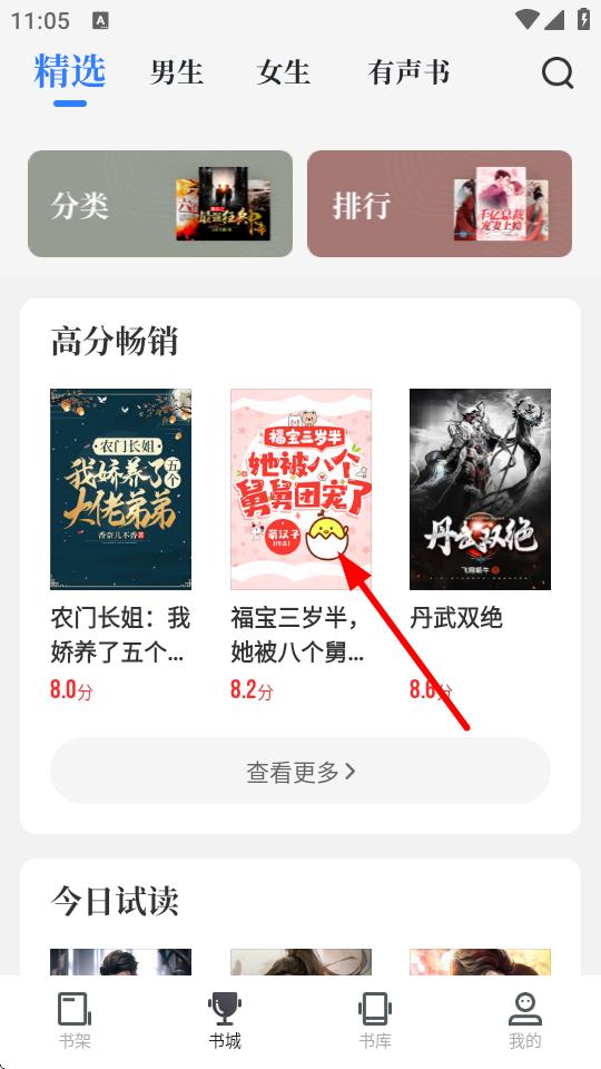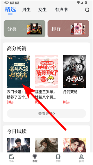 1、打開中文書城APP,在精選頁面找到并點(diǎn)擊小說福寶三歲半,她被八個(gè)舅舅團(tuán)寵了。