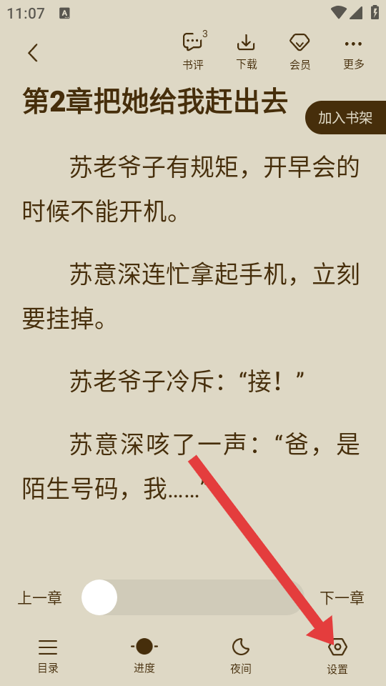 3、在閱讀界面中,點(diǎn)擊底部導(dǎo)航欄最右側(cè)的設(shè)置選項(xiàng)。