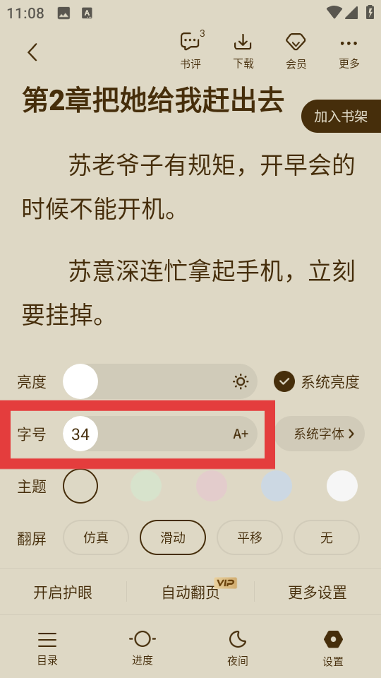 4、在彈出的設(shè)置窗口里,找到字號(hào)一欄,通過滑動(dòng)滑塊或點(diǎn)擊A+來增大字體大小,以調(diào)整到合適的閱讀字號(hào)。