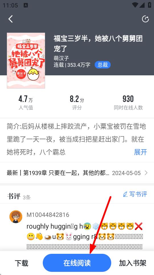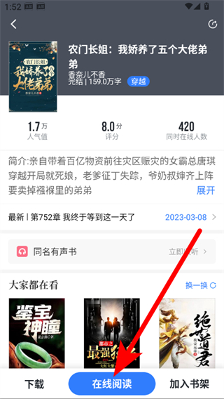 2、進(jìn)入小說詳情頁后,點(diǎn)擊下方藍(lán)色的在線閱讀按鈕,進(jìn)入閱讀界面。