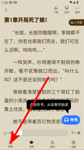 3、在書籍閱讀頁面,點(diǎn)擊左下角目錄選項(xiàng),彈出目錄列表。