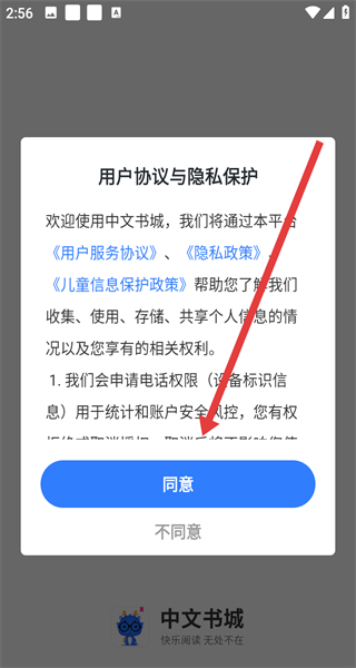 1、打開中文書城APP,點(diǎn)擊同意按鈕,確認(rèn)用戶協(xié)議與隱私保護(hù),進(jìn)入APP主界面。