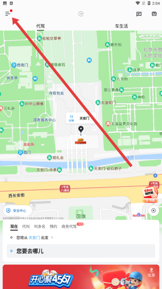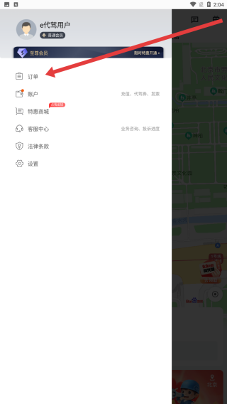 1、點(diǎn)擊e代駕代駕頁(yè)面左上角菜單圖標(biāo),展開(kāi)用戶功能側(cè)邊欄。