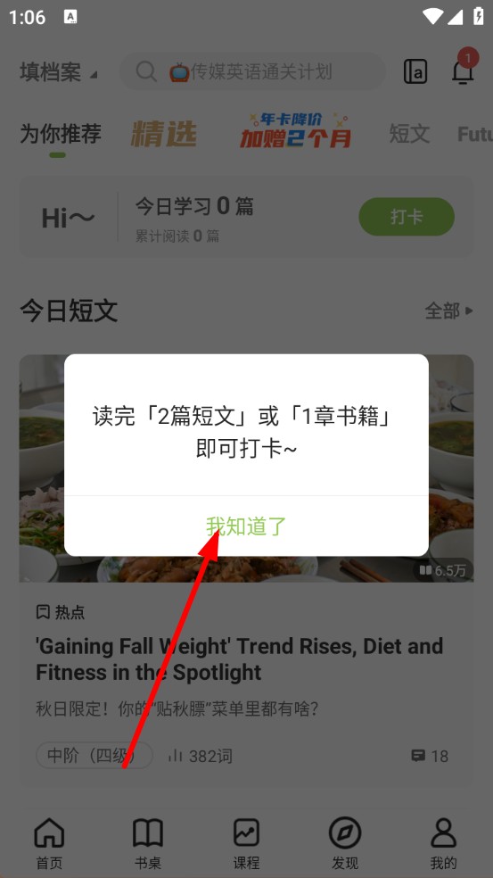 2、彈出讀完「2篇短文」或「1章書籍」即可打卡提示,點(diǎn)擊我知道了關(guān)閉彈窗。